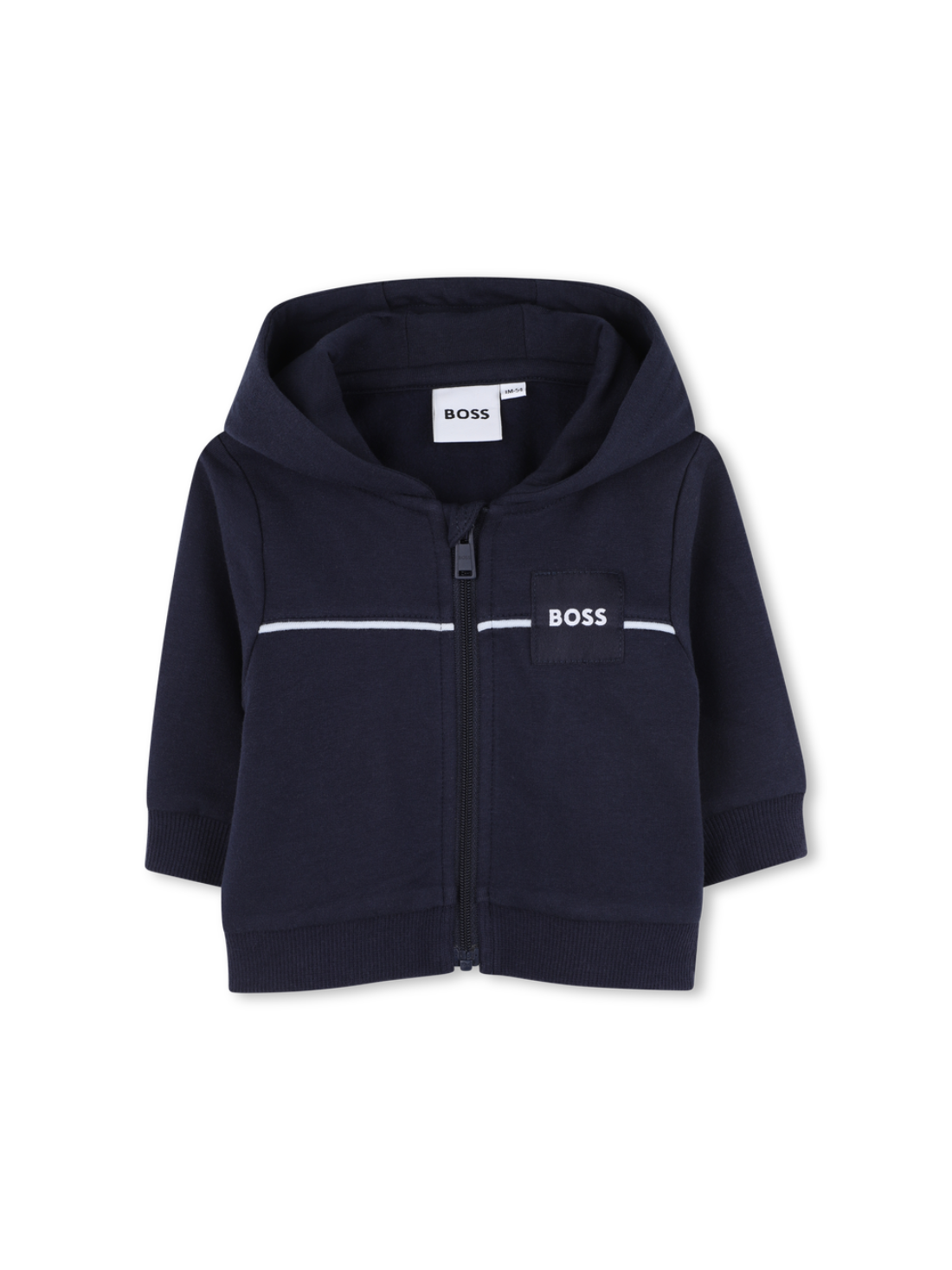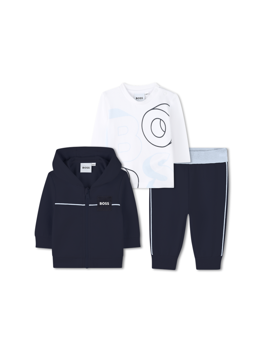 Cet ensemble BOSS trois pièces réunit confort et style. Le cardigan zippé à capuche en molleton présente une bande rayée sur la poitrine et une vignette siglée discrète. Le pantalon de jogging, en molleton gratté, s'anime de rayures sur les côtés. Le t-shirt à manches longues, en jersey extensible, se dote d'un imprimé fantaisie sur le devant et d'une patte pressionnée à l'épaule. La matière principale de ce produit contient du coton issu de l'agriculture biologique (voir détail ci-dessous : Traçabilité et Fabrication)