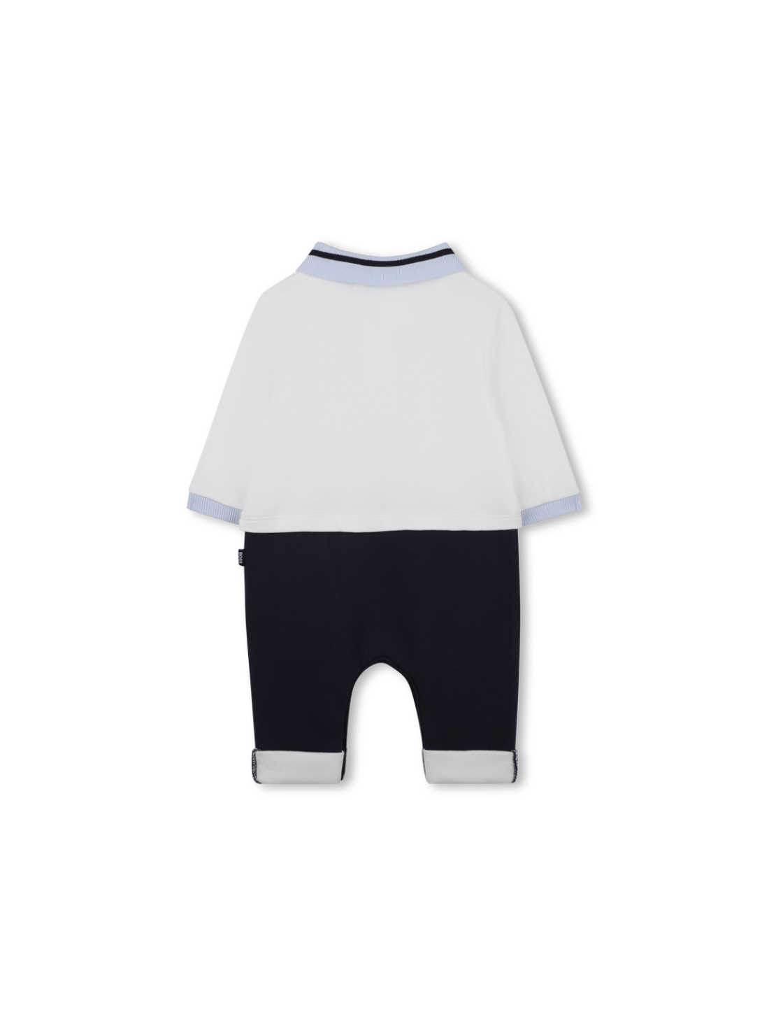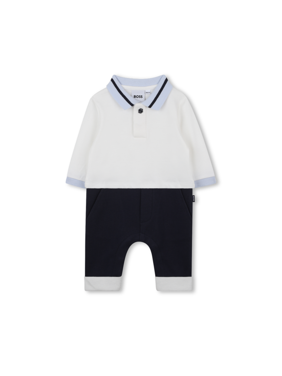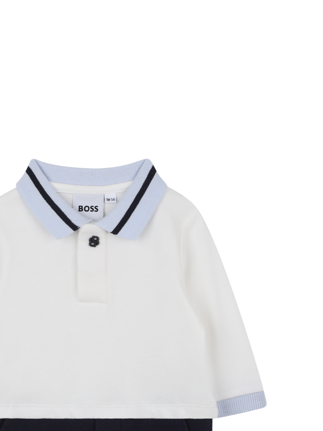 Cette combinaison BOSS pensée pour les grandes occasions marie élégance et douceur. Sa matière principale contient du coton issu de l'agriculture biologique (voir détail ci-dessous : Traçabilité et Fabrication), elle arbore un col polo rayé fermé par pressions. Le rivet métallique "Double B" au col apporte une touche raffinée, tandis que les poches latérales et l'étiquette siglée soulignent une finition soignée. Une pièce parfaite pour les premiers moments chic.
