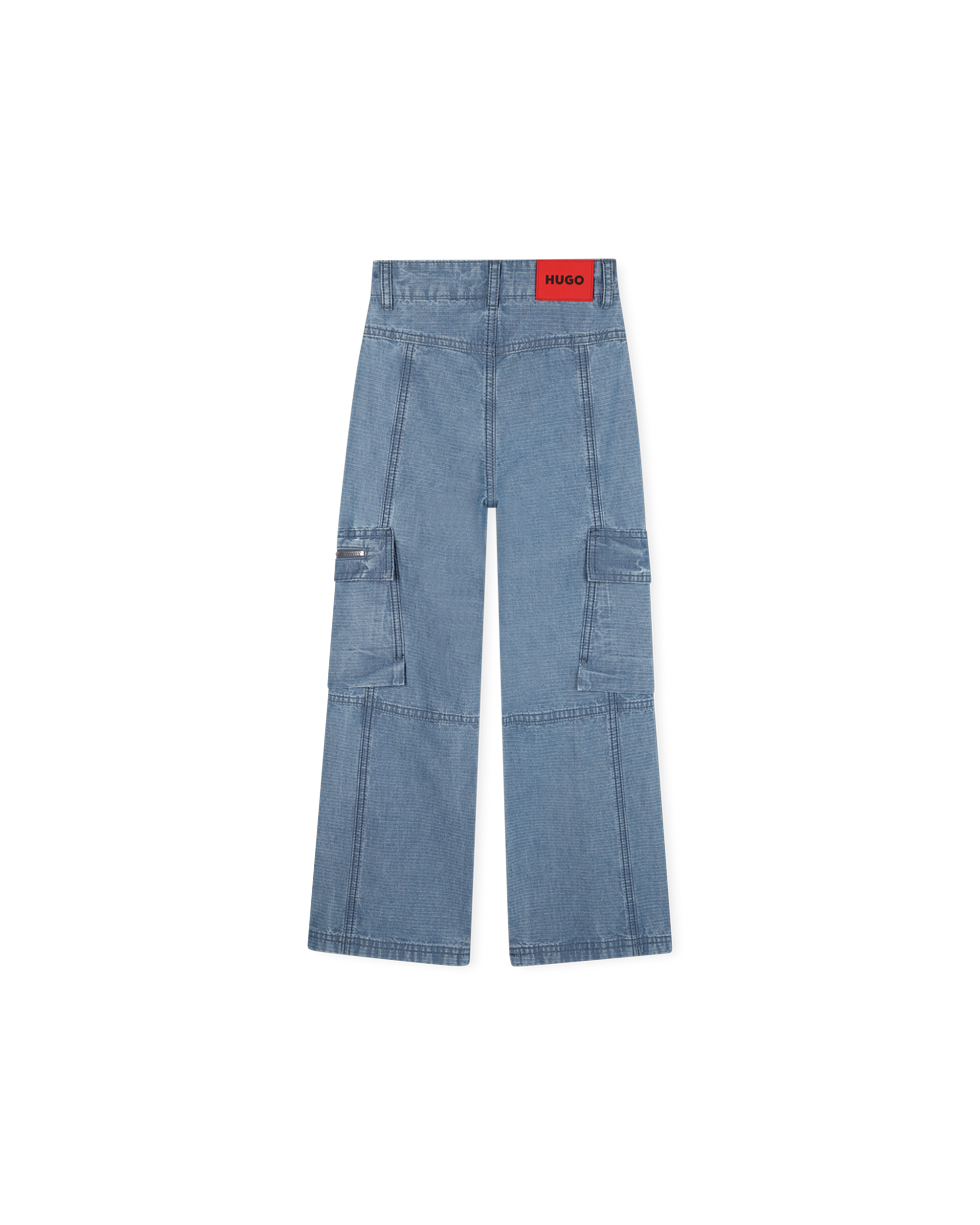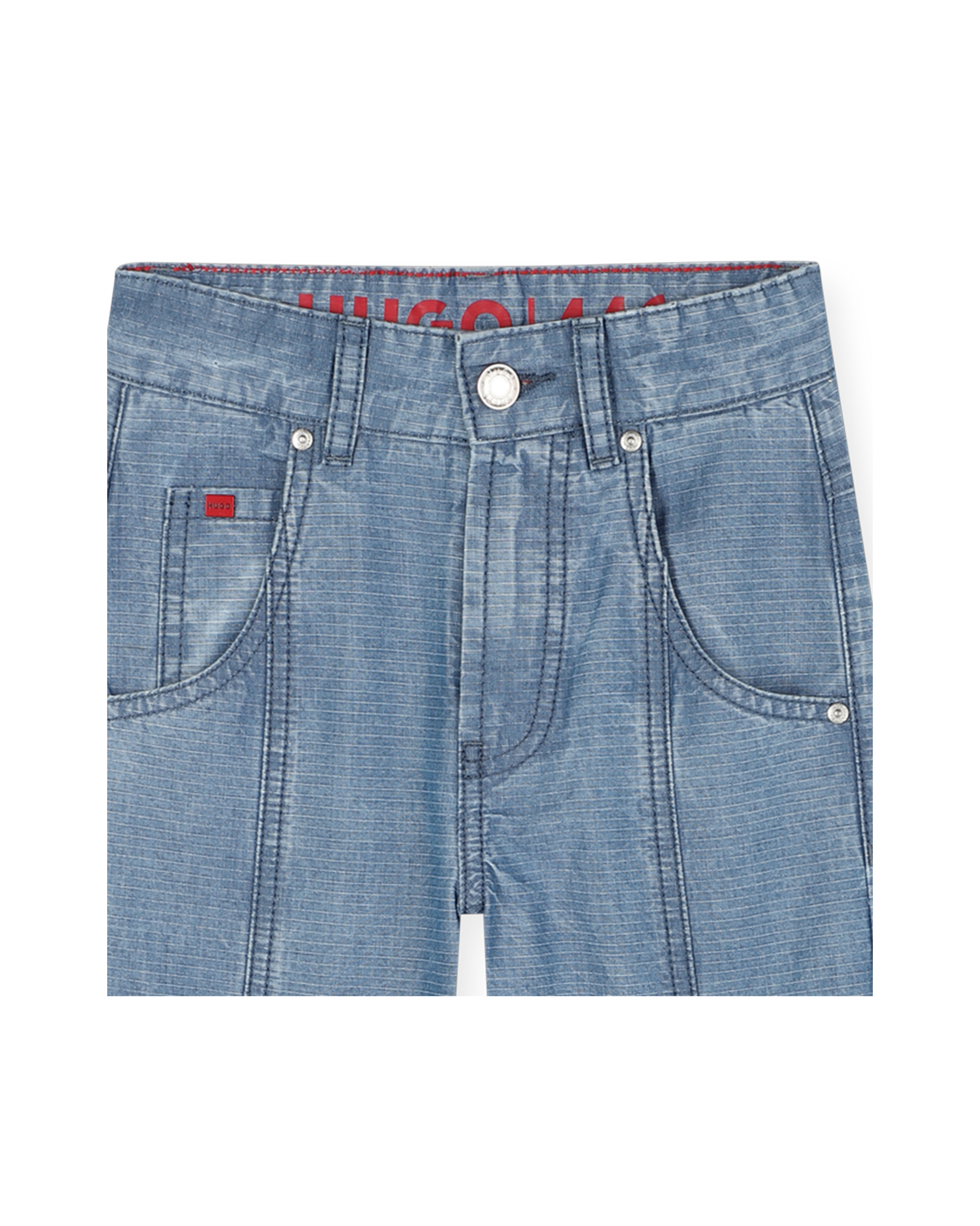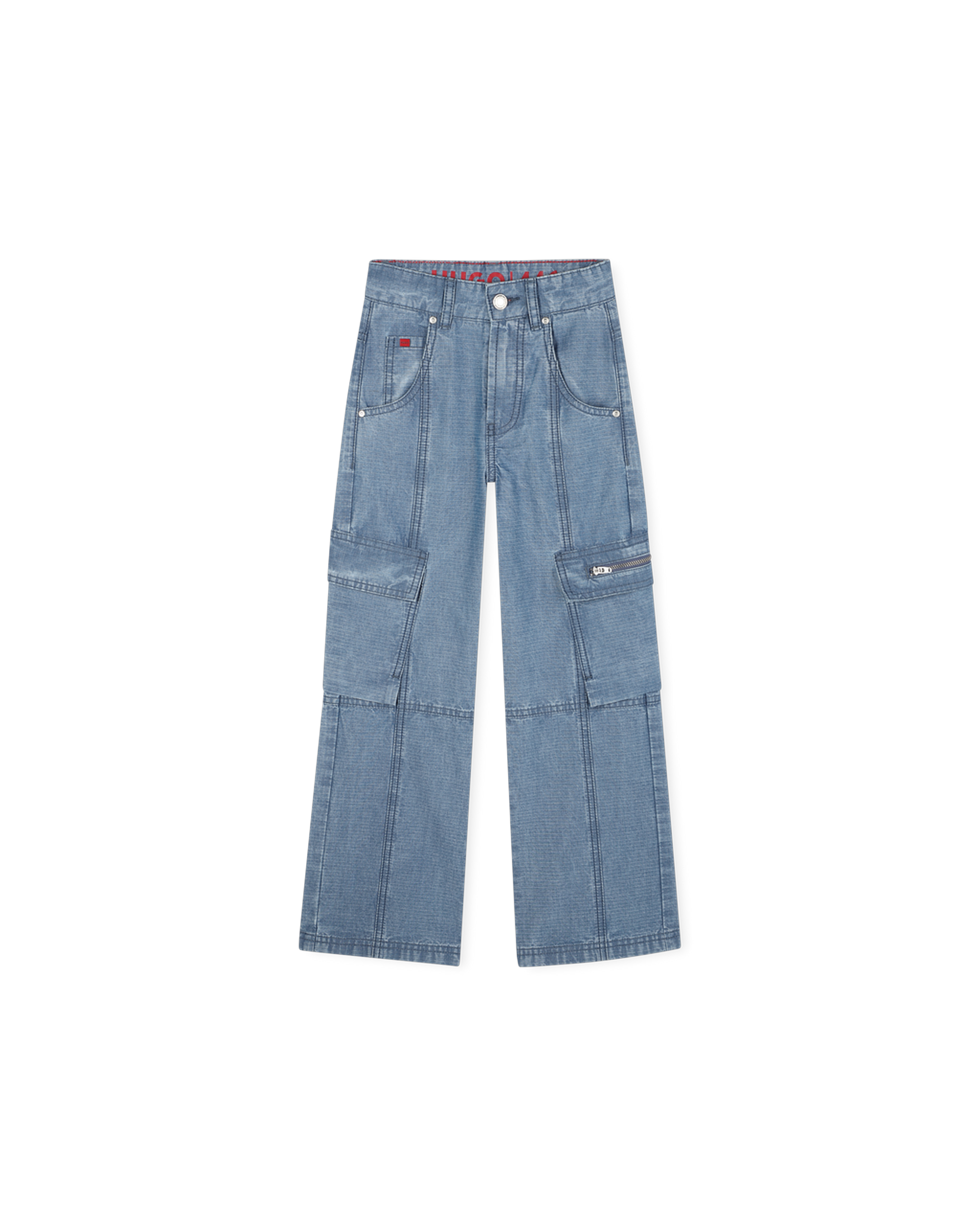 Ce pantalon denim bleu signé HUGO est conçu pour allier confort et fonctionnalité.Il est doté de cinq poches pratiques, dont deux poches à rabat sur les côtés et un rabat zippé pour un rangement sécurisé. Les découpes fantaisie ajoutent une touche de modernité, et l'étiquette gomme siglée à l'arrière offre un détail élégant.